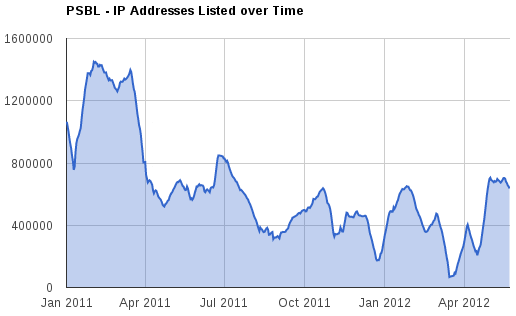 A lot of the variation in PSBL zone size seems to be due to both random variations in spam volume, as well as law enforcement shutting down botnets. Whenever a big botnet has been shut down, spam activity tends to be noticably less than before. I expect email spam is down simply because the spammers have also found alternative ways to spam, eg. click hijacking and sharing of spam material through social media.This is an update to a similar chart from last year.